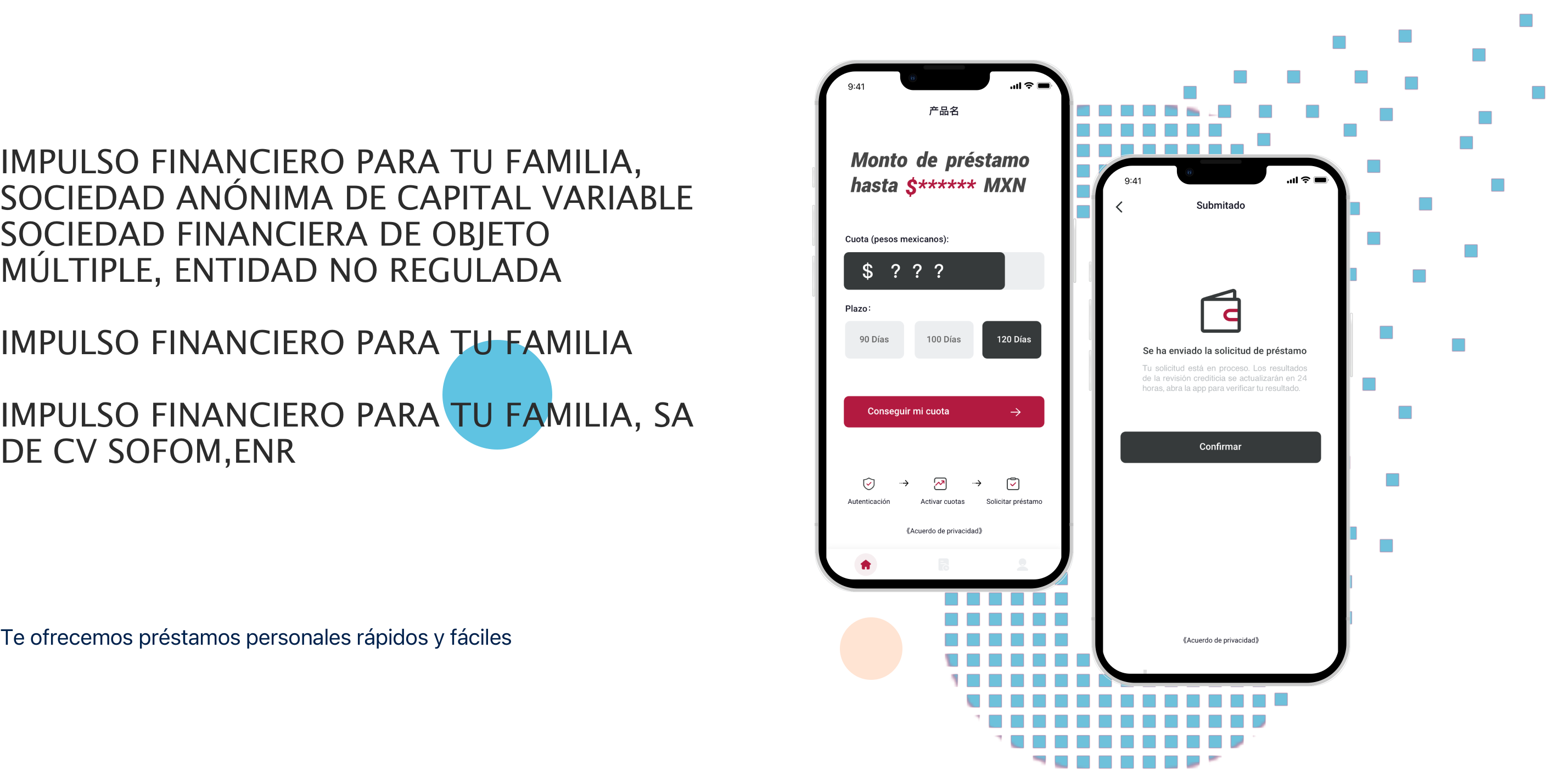 IMPULSO FINANCIERO PARA TU FAMILIA SA de CV es una Sociedad Financiera de Objeto Múltiple, Entidad no regulada (SOFOM ENR), que se dedica al otorgamiento de préstamos personales, grupales y de nómina, además de seguros y otros servicios, a personas físicas de bajos ingresos en México. El análisis de macrodatos basado en operadores móviles y otros socios, soluciones tecnológicas únicas y procesos de calificación crediticia patentados, innovadores y automatizados para la toma de decisiones crediticias rápidas son algunos de los pilares clave de los productos nuestros.